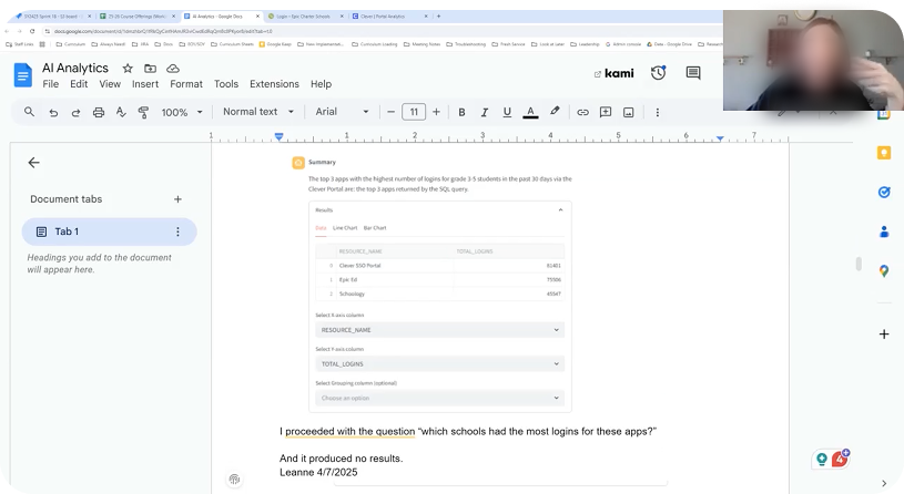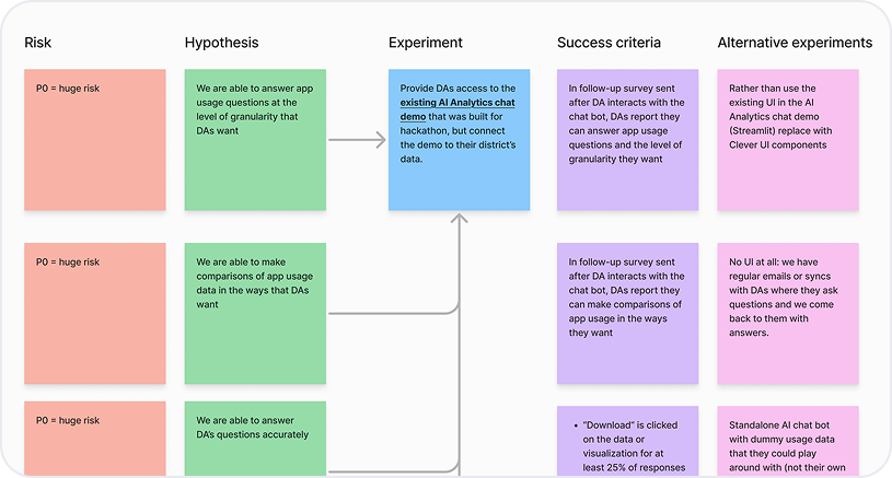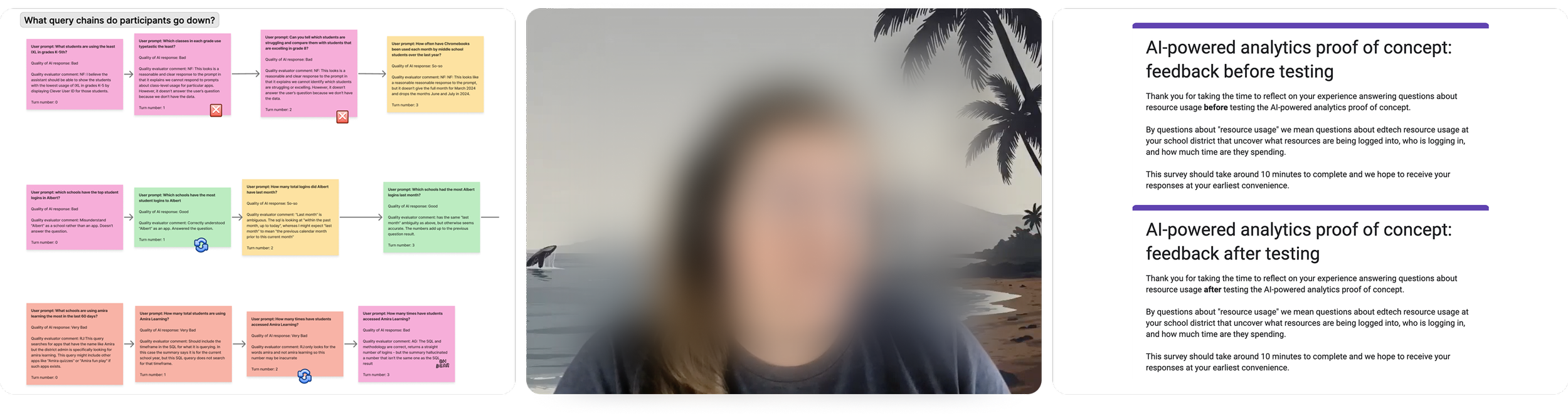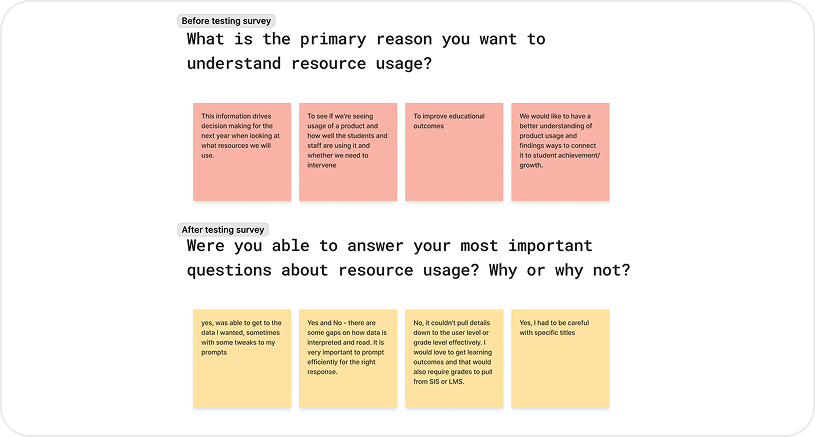 Based on my research findings and recommendations, rather than continue to build and ship an AI Analytics Assistant in 2025, the executive team requested our team shift focus to restructuring our analytics databases to include user and class level data to support all of our analytics products.