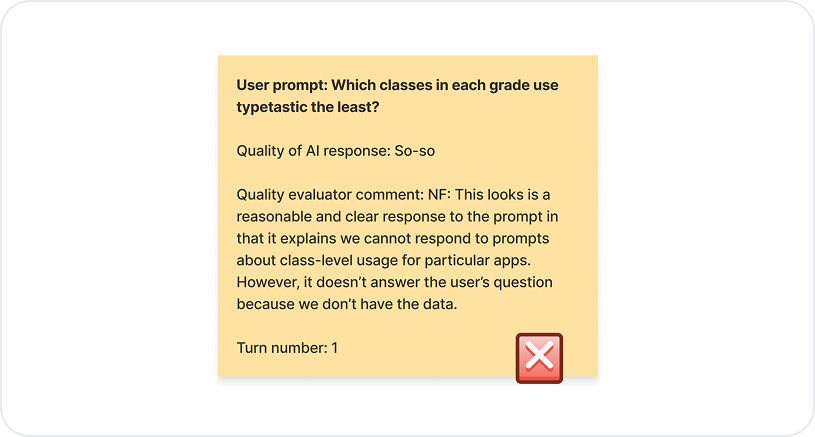 I developed a quality rating criteria with my engineering manager and product manager. As a first pass at synthesis, the whole engineering team used these ratings daily to evaluate AI responses as they came in.