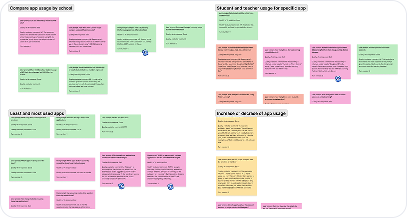 I color-coded stickies to track how well AI Analytics responded to admins’ queries for each chain of related queries.