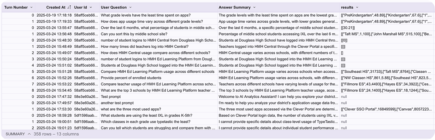 Query chain analysis to observe how district admins interacted with AI analytics and how well it responded to their prompts.