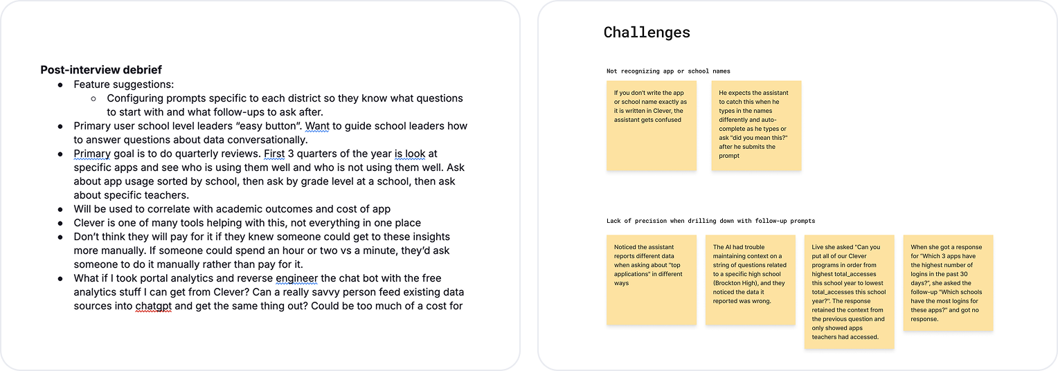 As our first pass at synthesis for interviews, I debriefed with the note taker to capture our key takeaways.