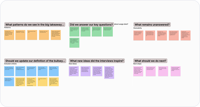 With my product manager, I affinity mapped the key takeaways from interview debriefs into key themes.