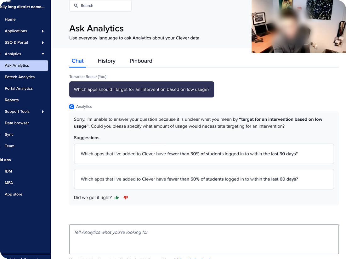 Observe how district admins interacted with AI analytics and how well it responded to their prompts.