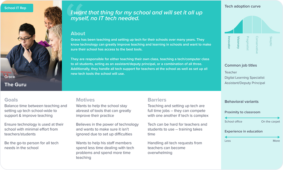 In addition to identifying key themes with affinity mapping, I also translated my learnings into personas to show the range of how edtech makes its way into single schools.