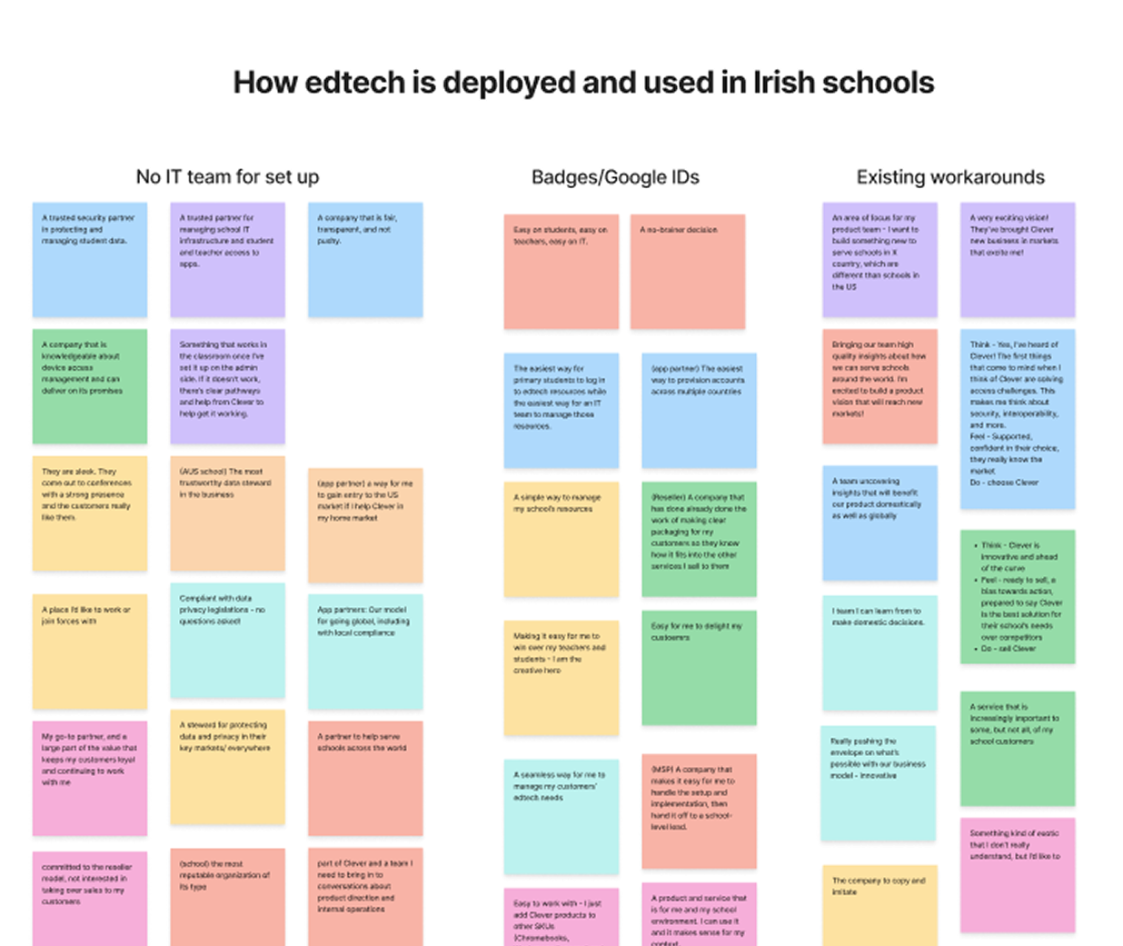 I chose school customers already using Clever GO to understand how our product was being used and the gaps that existed, school customers not yet using Clever GO to learn what unmet needs schools had, and edtech resellers to determine how we could be the best partner possible in the Irish edtech ecosystem.